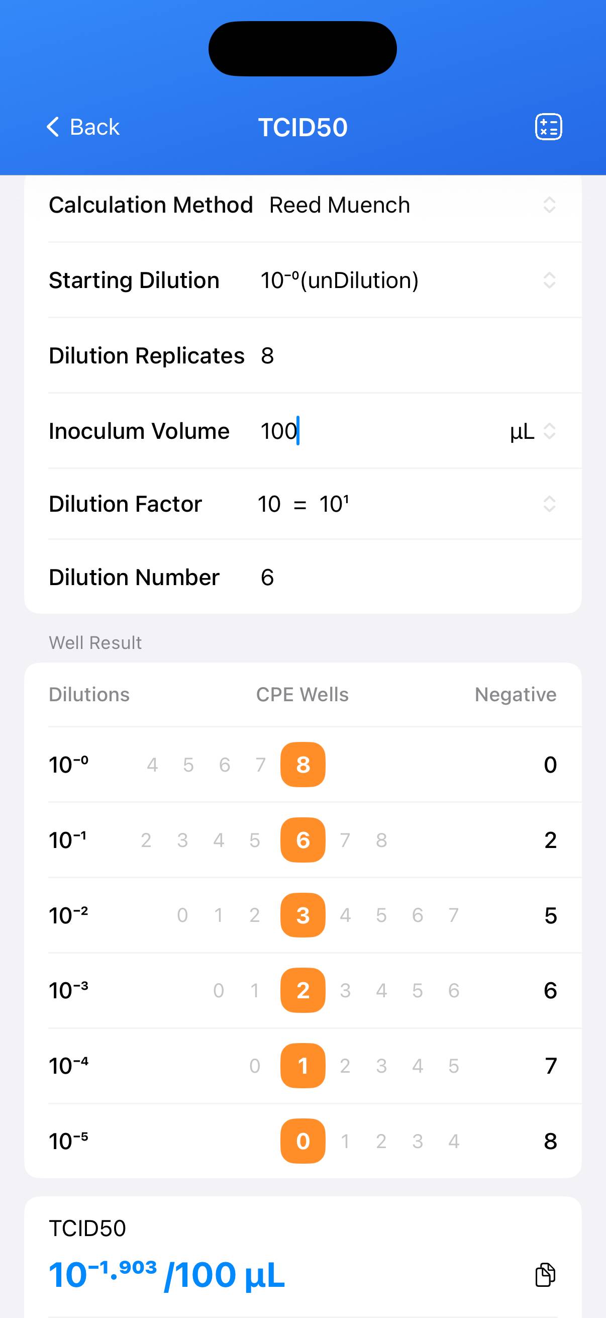 This tool calculates the TCID50 (50% Tissue Culture Infective Dose) of a virus stock using either the Reed–Muench method (Reed & Muench, 1938) or the Spearman–Kärber method (Spearman, 1908; Kärber, 1931).