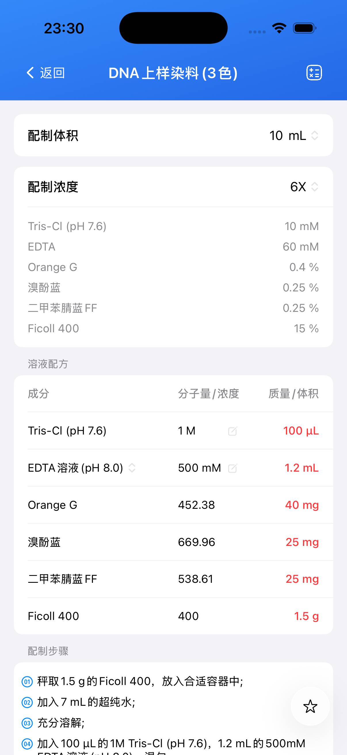 - Ficoll 400可用60% (v/v)甘油或40% (w/v)蔗糖替代;蔗糖溶液需冷冻保存。