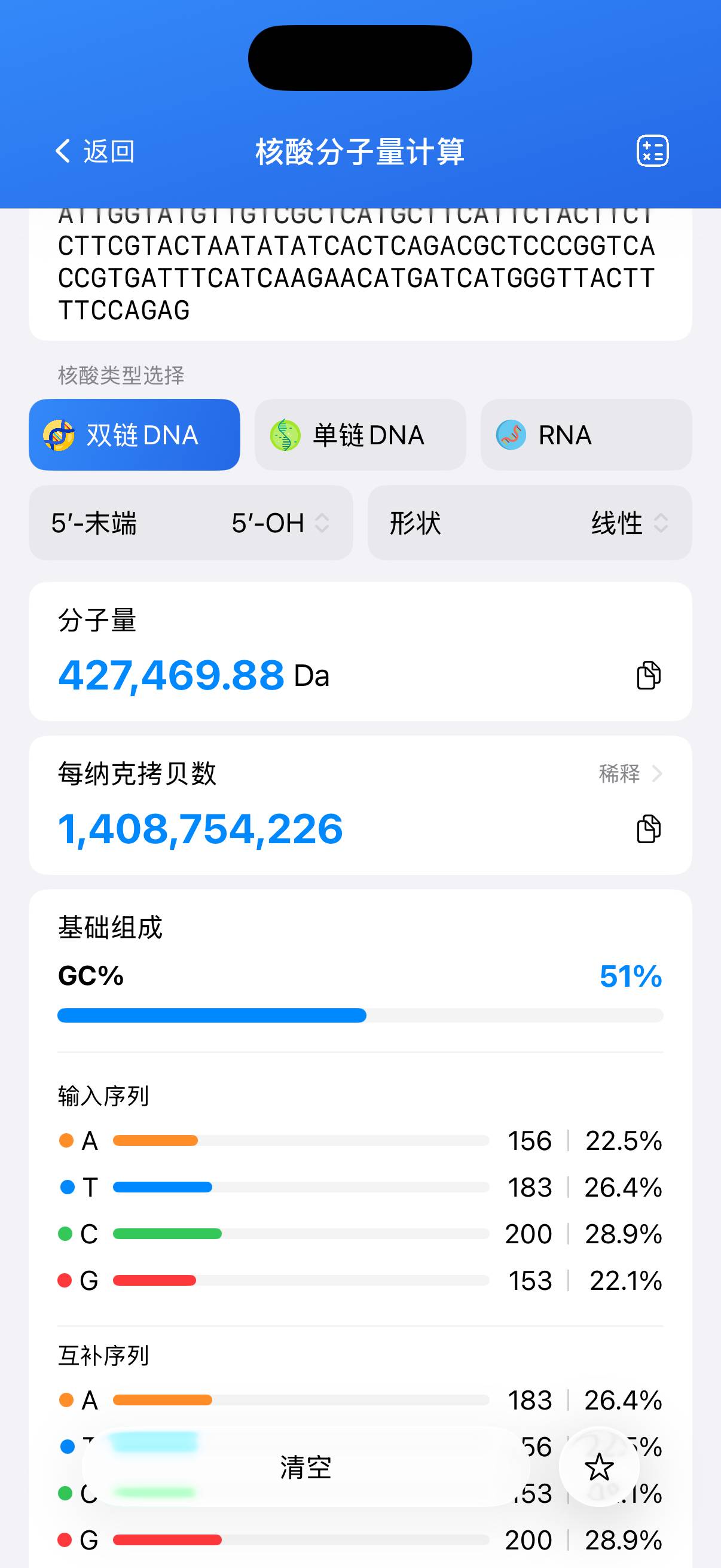 输入核酸序列即可计算精确分子量。 - 支持核酸类型: