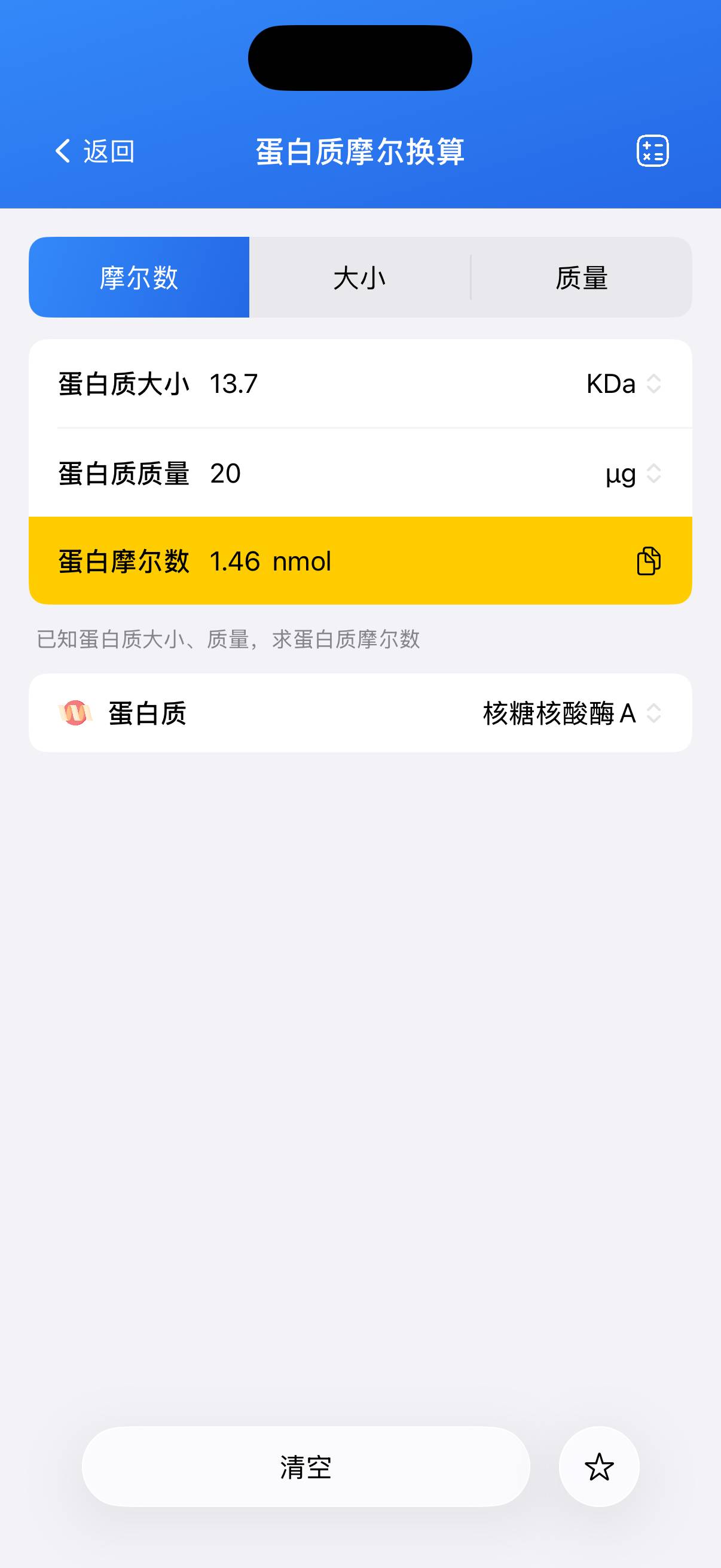 其中:1 kDa = 1,000 g/mol。本计算器可自动完成所有单位换算(如 µg → g、pmol → mol),从而节省时间并避免人工计算错误。