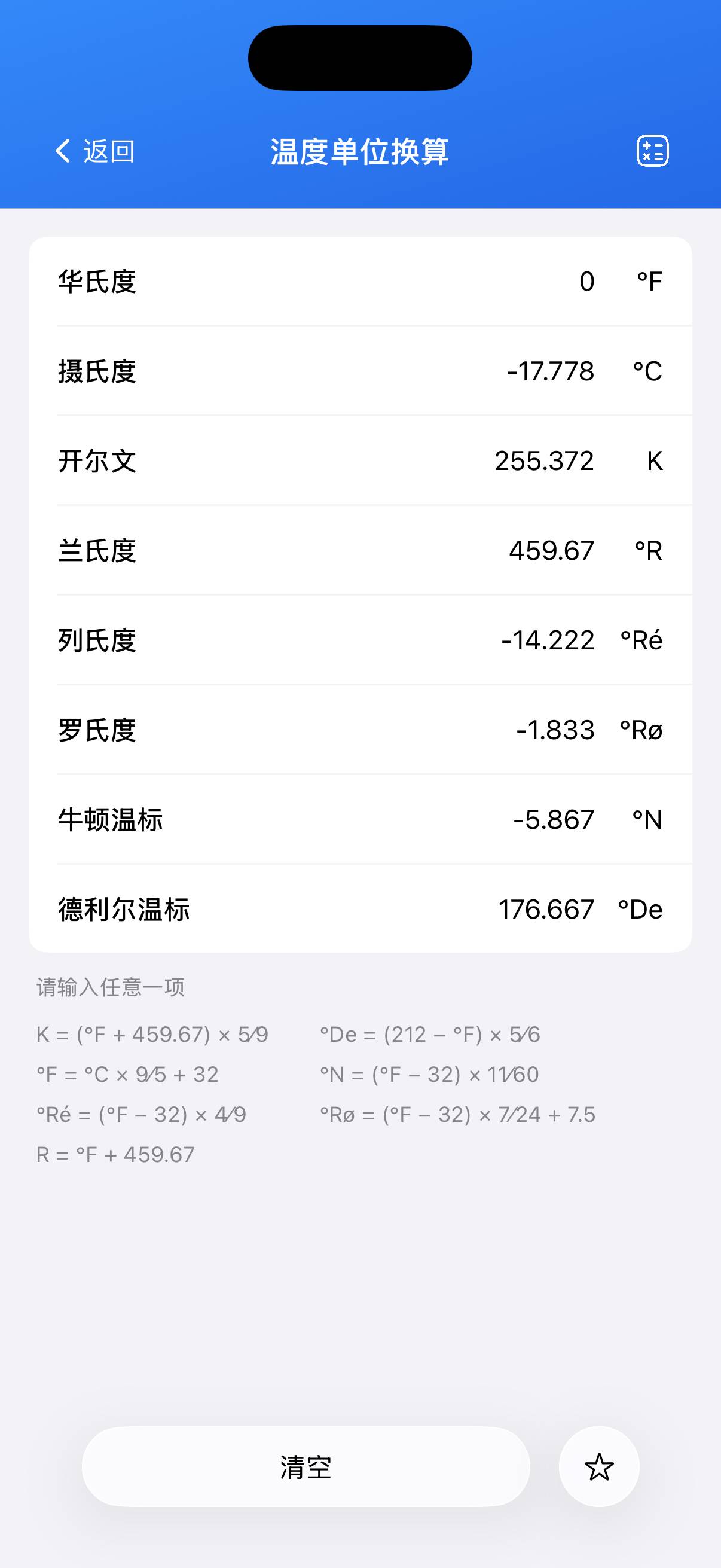 温度单位转换器可将温度值在八种常见温标之间进行换算,包括摄氏度、华氏度、开尔文、兰氏度、 德利尔度、牛顿度、列氏度和罗氏度。输入任意一个温标的温度,转换器将自动计算所有其他温标的值。