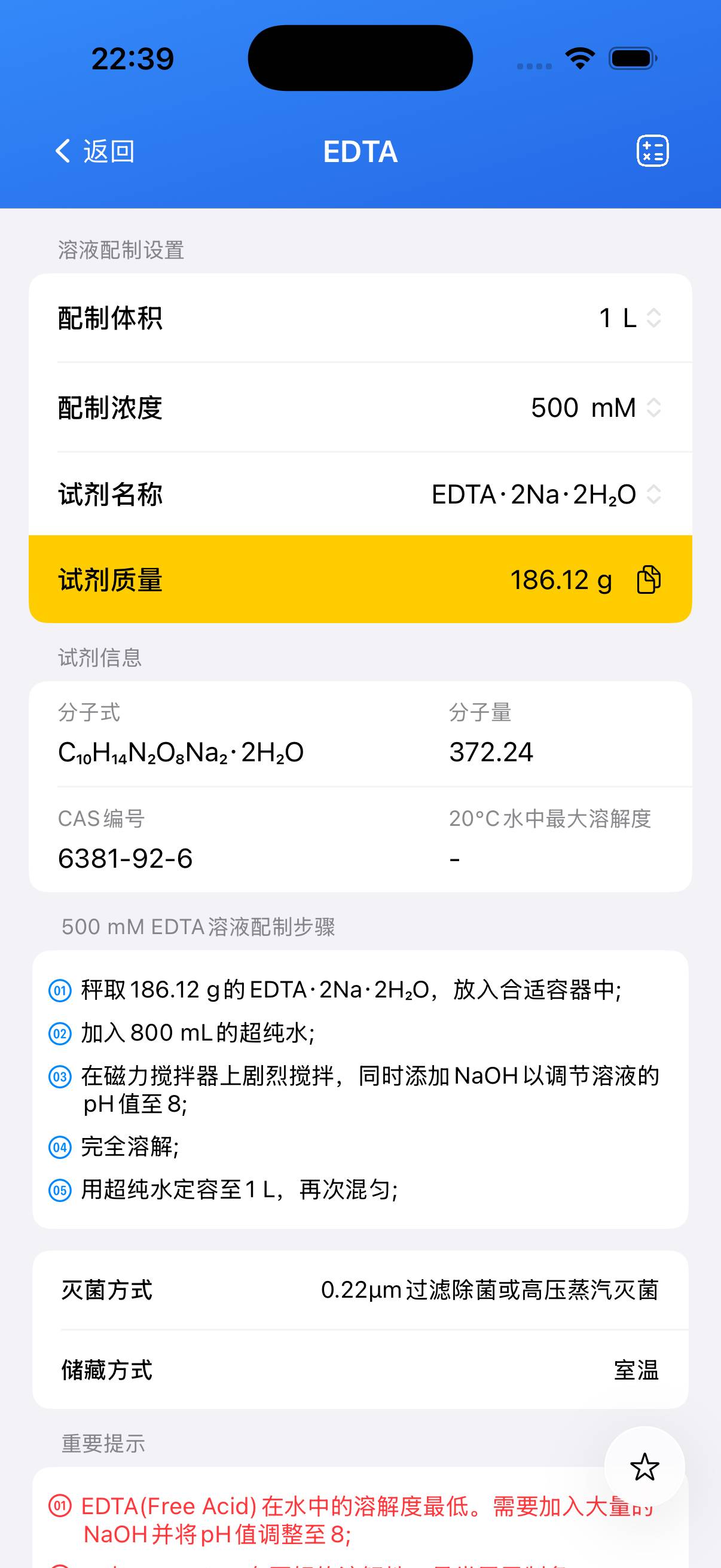 在水中的溶解度最低,通常需要加入大量 NaOH(约 3.1 当量)将 pH 调至 8.0 才能完全溶解。 - EDTA 二钠二水合物