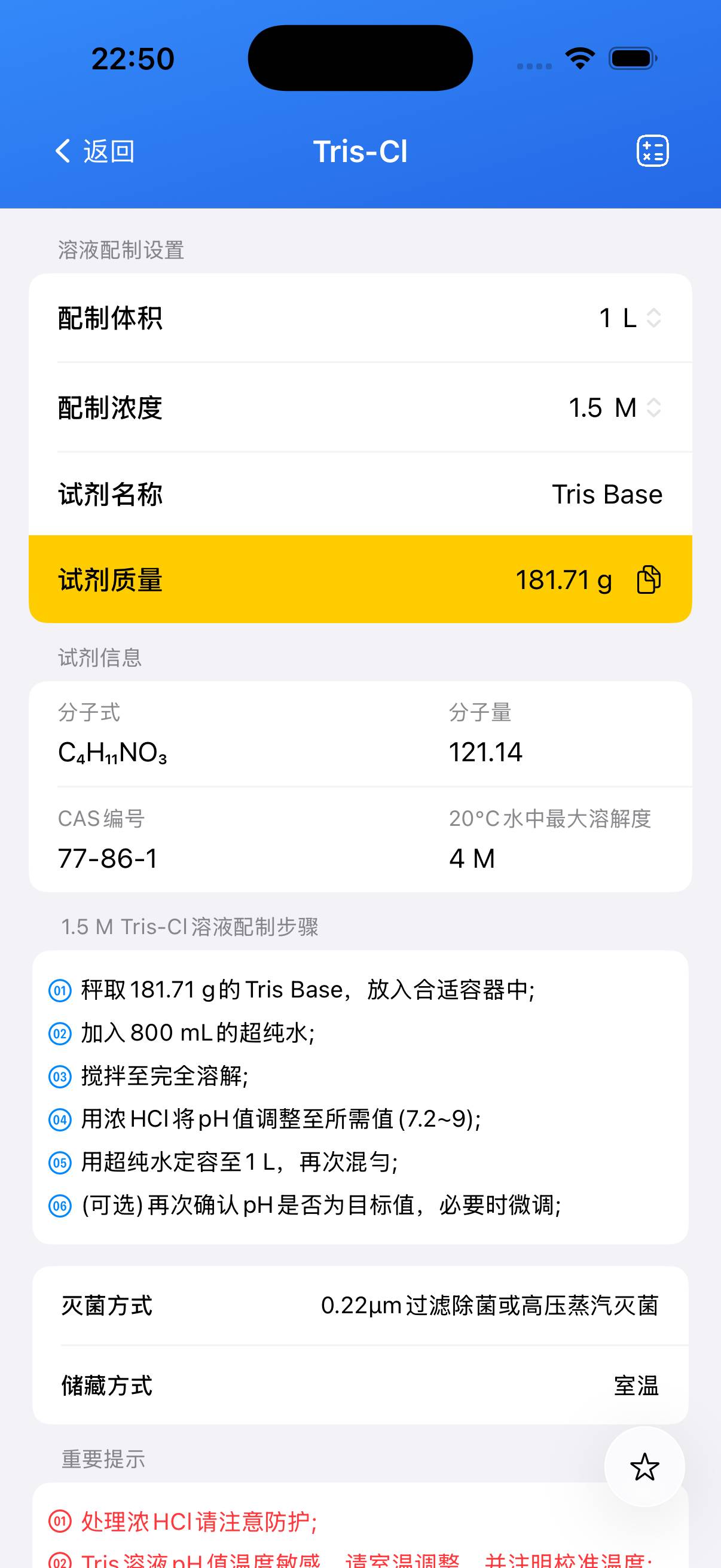 - 称取 121.14 g Tris Base 并置于 1 L 容器中。
