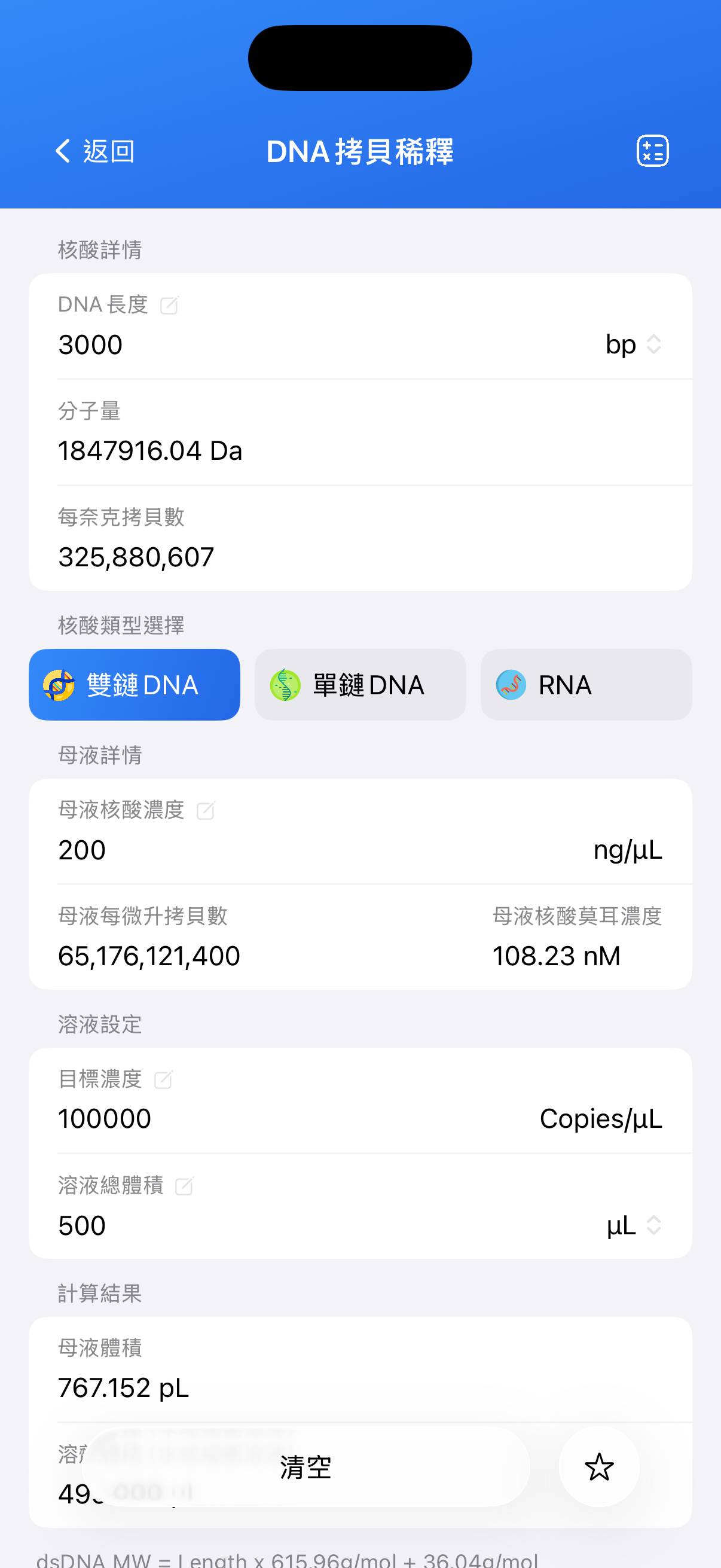 本工具同時支援稀釋計算與核酸定量分析,不僅限於單一用途。