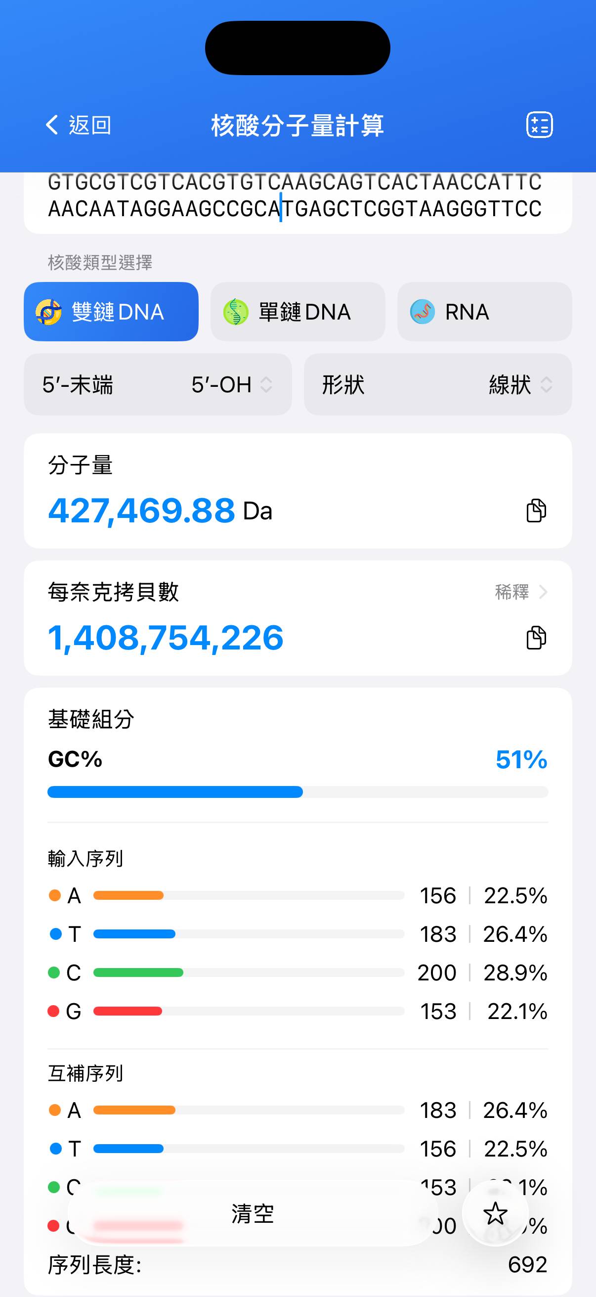 輸入核酸序列即可計算精確分子量。 - 支持核酸類型: