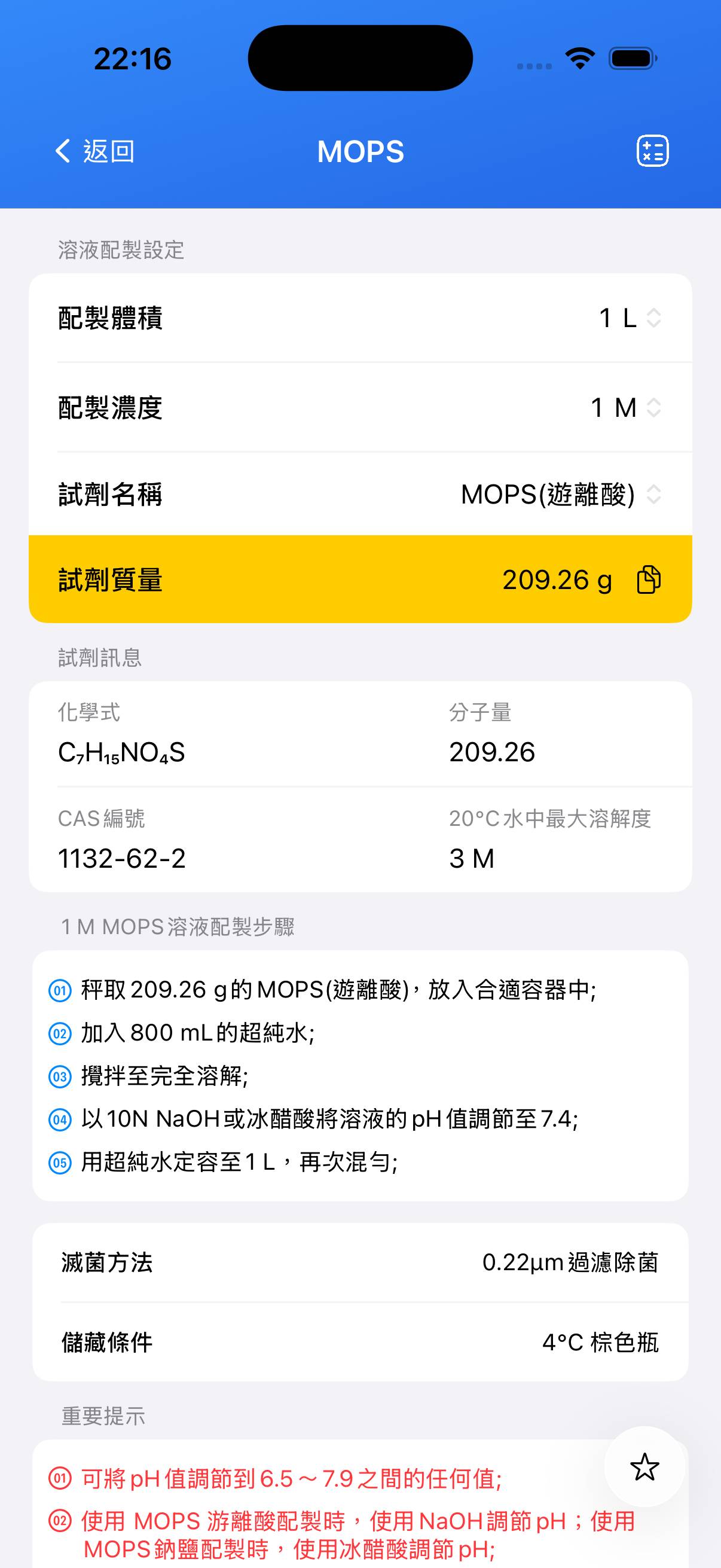 配製 500 mL 1 M MOPS 緩衝液(pH 7.4)儲備溶液。