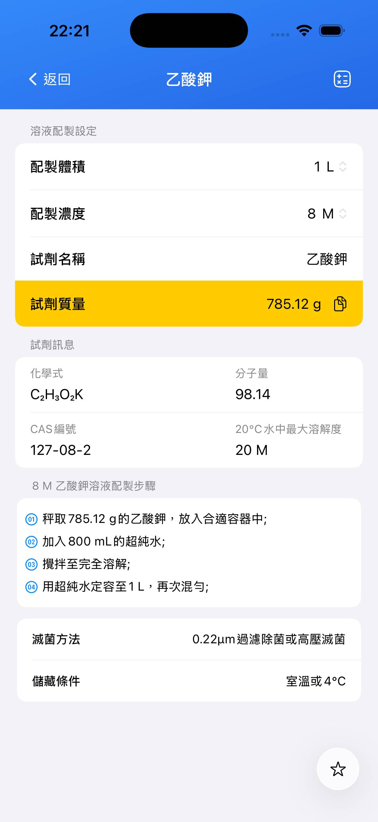 注意:乙酸鉀溶液一般呈中性或微鹼性。請在容器上清晰標示濃度與製備日期,並妥善密封保存。