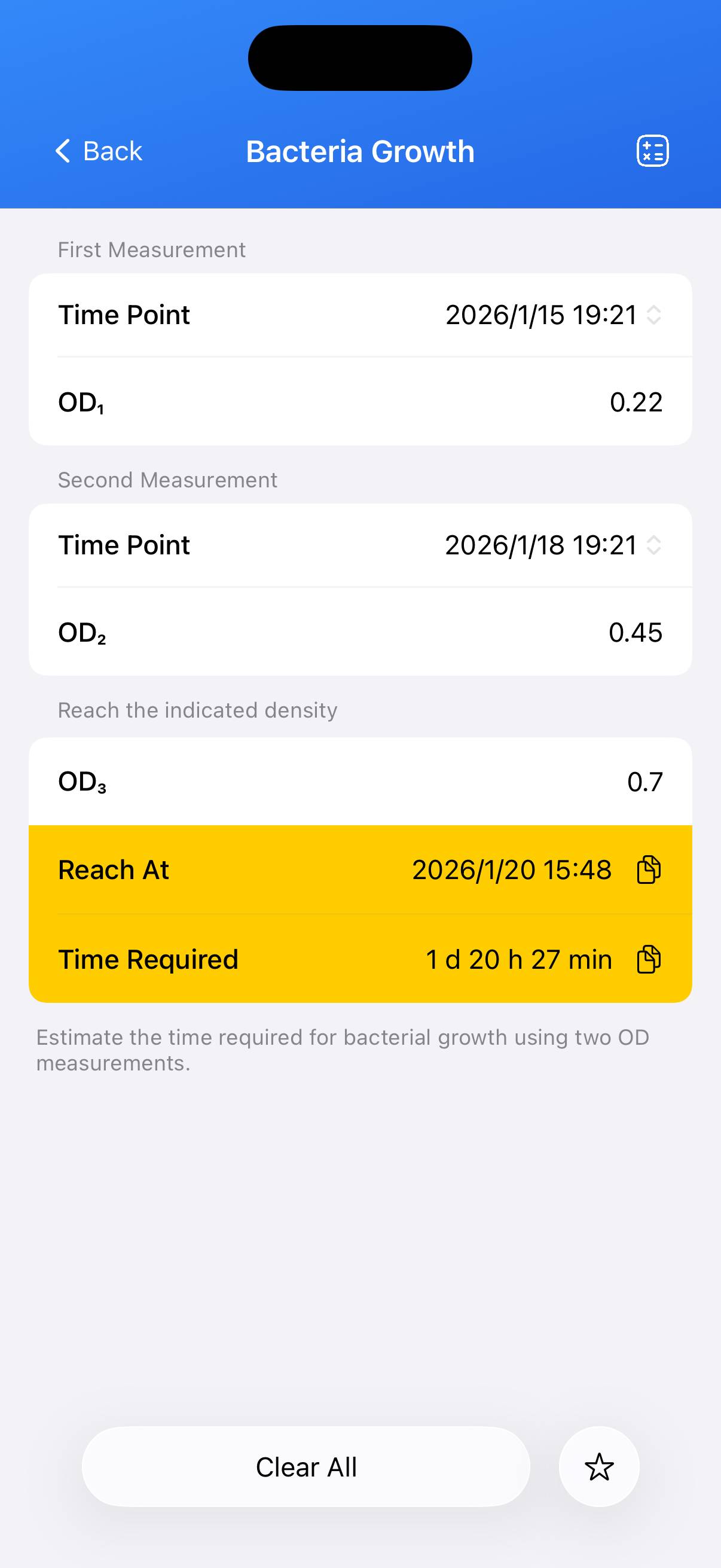 By entering two optical density (OD) measurements taken at different time points, the tool calculates the growth rate of the culture. Using this growth rate, it predicts the time at which a specified target OD (cell density) will be reached.