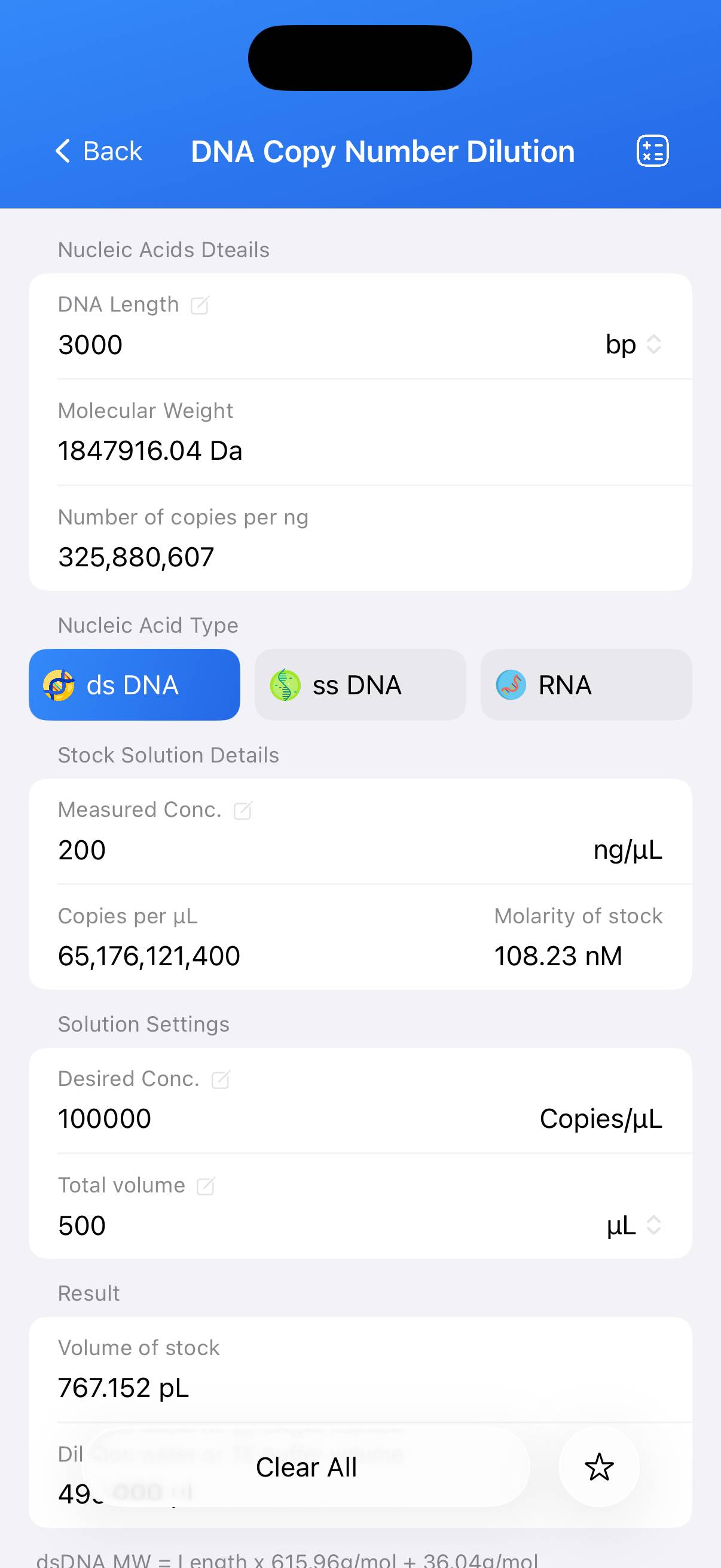 This tool calculates DNA copy number based on nucleic acid length and stock concentration (ng/μL).