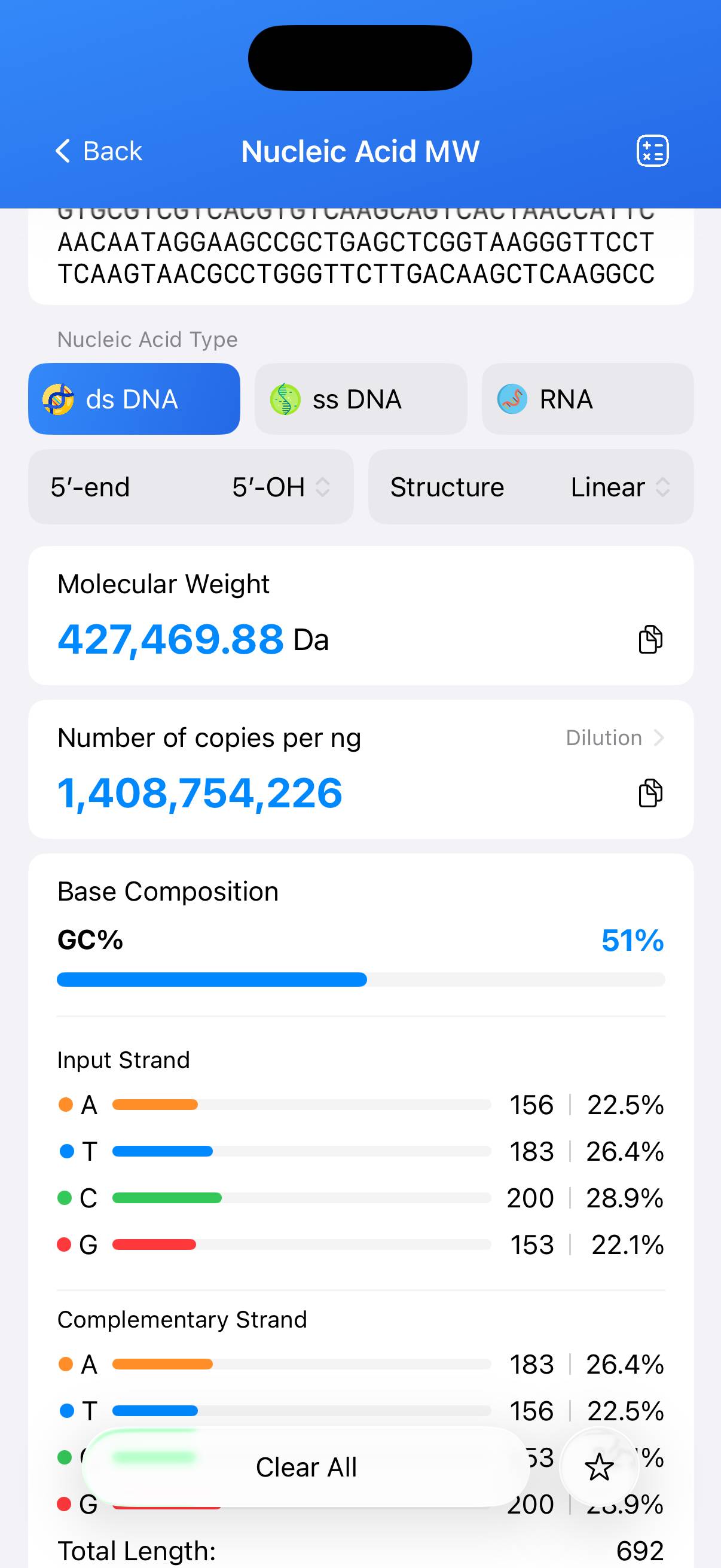 This tool calculates the precise molecular weight of a nucleic acid based on its sequence. It supports multiple adjustable parameters to accommodate different experimental designs and molecular types.