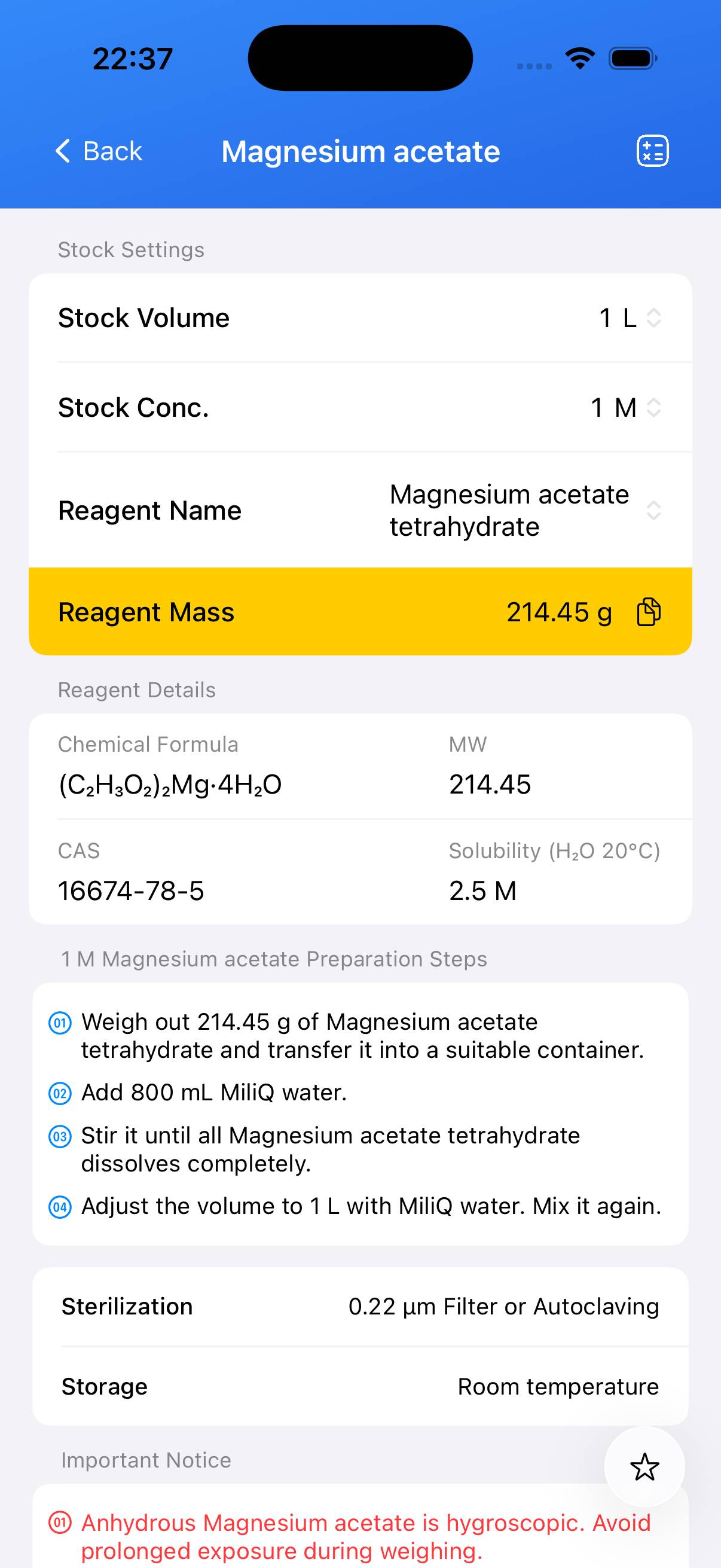 This guide describes the preparation of Magnesium acetate Stock Solution at a defined molarity for laboratory use.