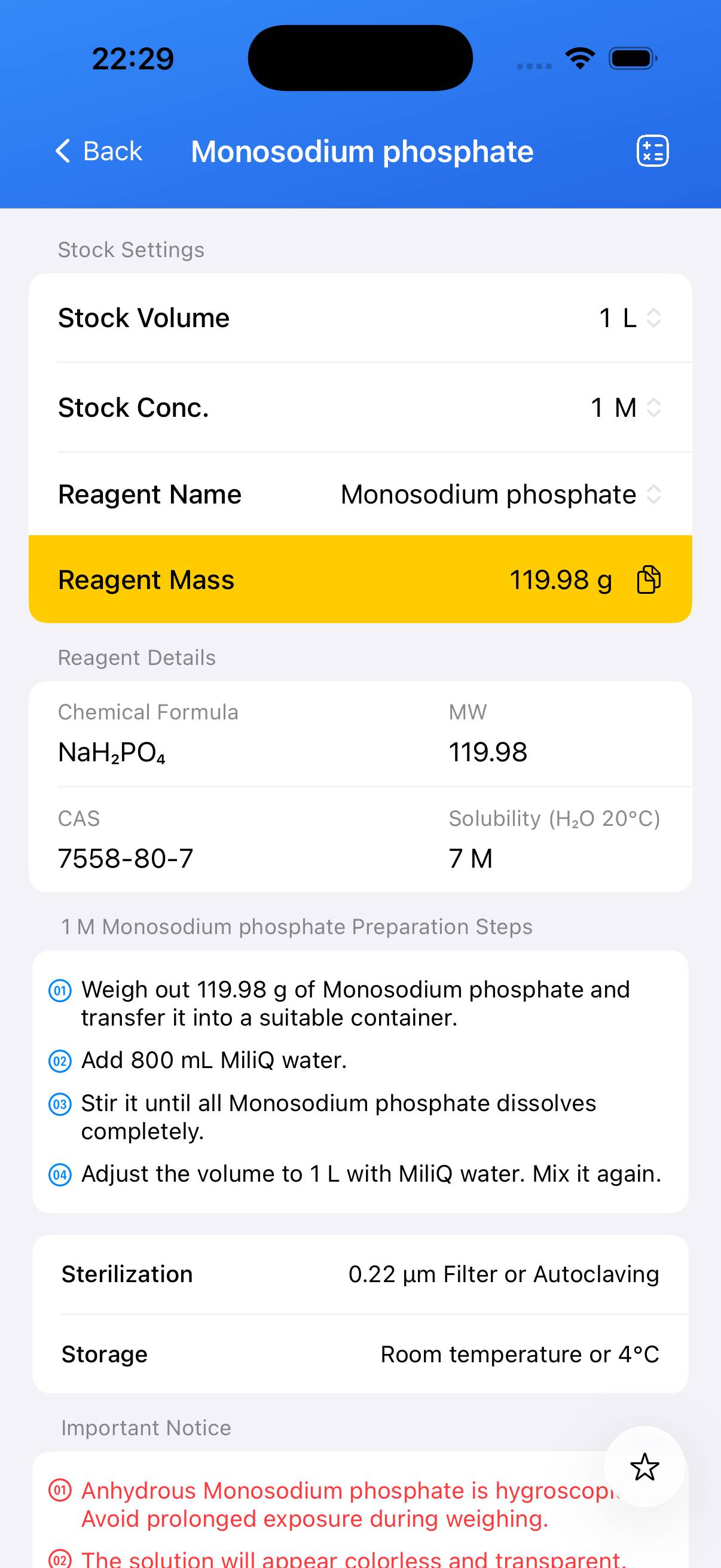 Monosodium phosphate (also called Sodium dihydrogen phosphate) can be used to prepare sodium phosphate buffers or other phosphate-based solutions. A 1 M stock solution is frequently used as a component when preparing phosphate buffers of desired pH by mixing with dibasic sodium phosphate.