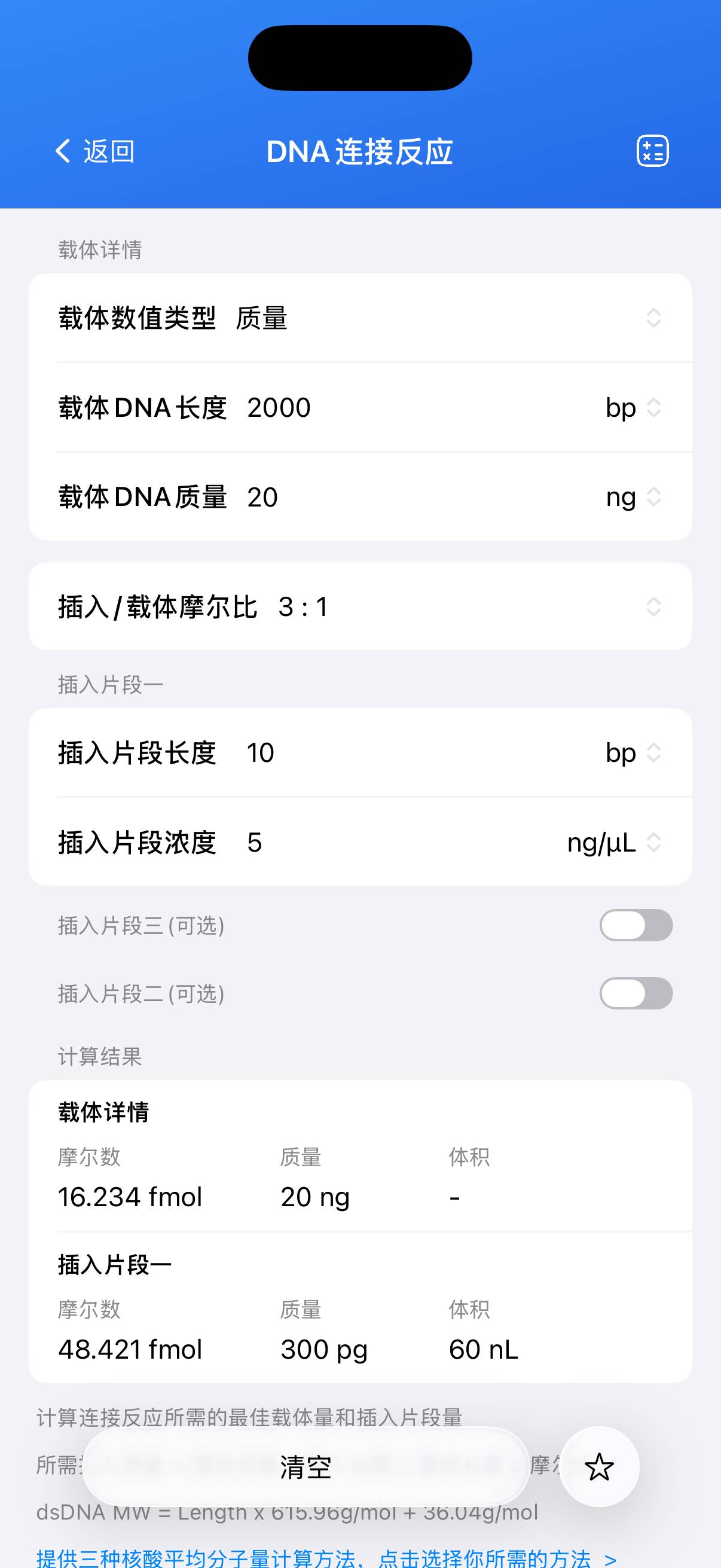 输入期望的 插入片段:载体 摩尔比例(如 3:1),工具会自动计算每个插入片段 所需的摩尔量(pmol)和质量(ng)。 - 精确体积计算: