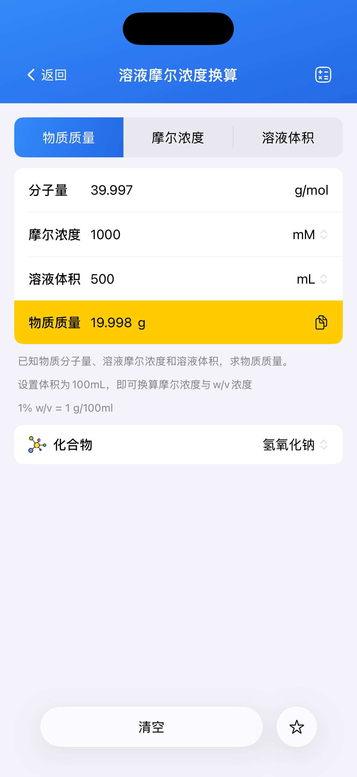 · 在已知化合物质量和目标浓度的情况下,所需溶液体积。