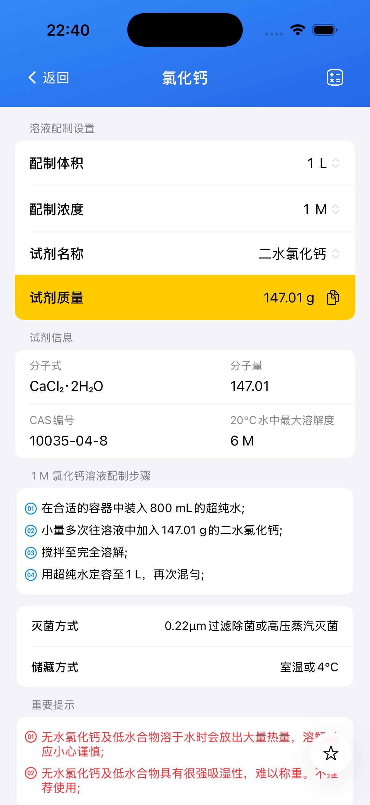 - 所得溶液应为透明无色,该 1 M 储备液可用于配制培养基和含钙溶液等用途。