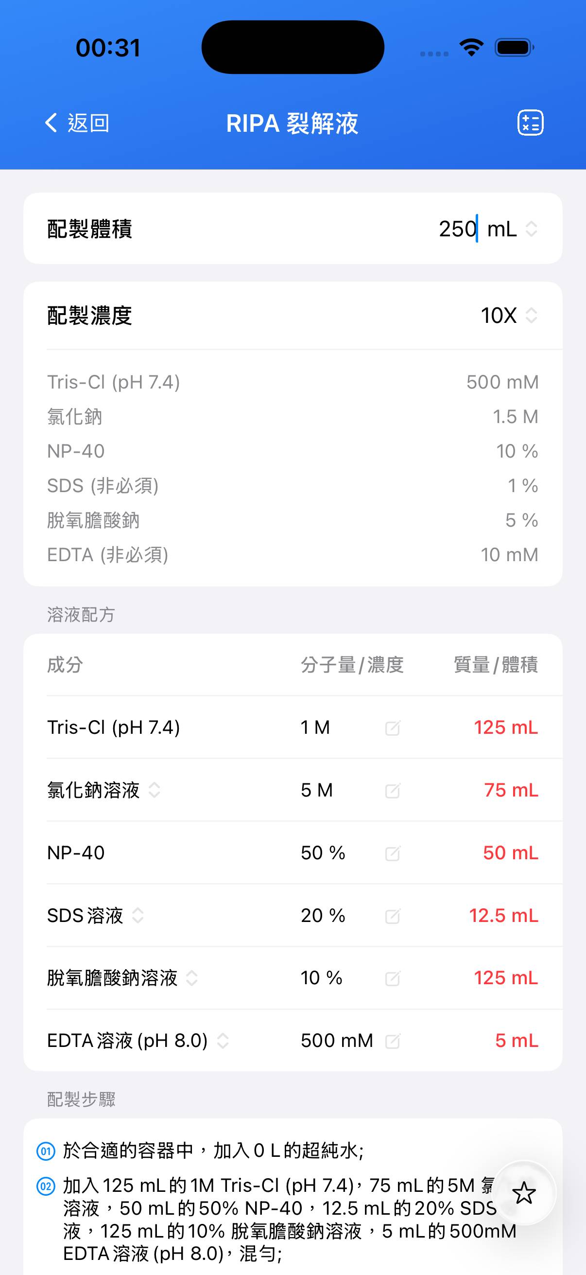 - 在使用當天加入蛋白酶與磷酸酶抑制劑(如抑蛋白酶肽、亮抑酶肽、胃蛋白酶抑制劑、PMSF、Na₃VO₄、NaF)以防止蛋白降解;PMSF在水溶液中非常不穩定,應於使用前立即添加。