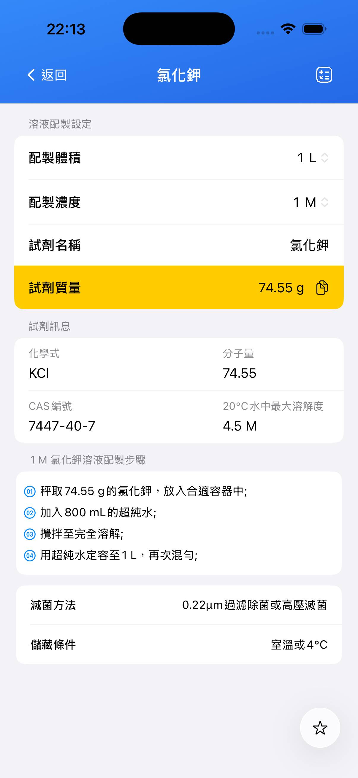 - 混合均勻後即可使用這份 1 M KCl 儲備液。